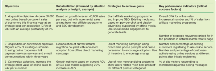 We recommend that objectives are clearly aligned with strategies to achieve goals and the drivers of these objectives such as business objectives or market research. Key performance indicators (KPIs) should also be detailed.