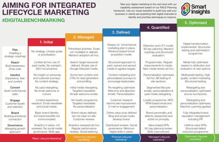 When completing your performance review you will have considered your existing capabilities to deliver these. Access our free digital marketing benchmarking templates to review your performance across RACE.