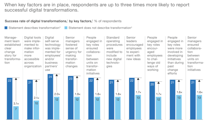These success factors are consistent with McKinsey research on unlocking success in digital transformations which highlights the importance of senior involvement for governance and to support change management and collaboration.