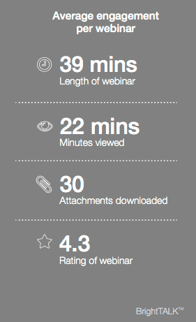 These figures suggest that most webinars are still targeting the 45 minutes or 60 minutes since the average if 39 minutes and there will be shorter duration webinars. The average viewing time of 22 minutes suggests that marketers should consider shorter webinars. Downloads are specific to the BrightTALK platform, but seem to work quite well as an engagement tactic.
