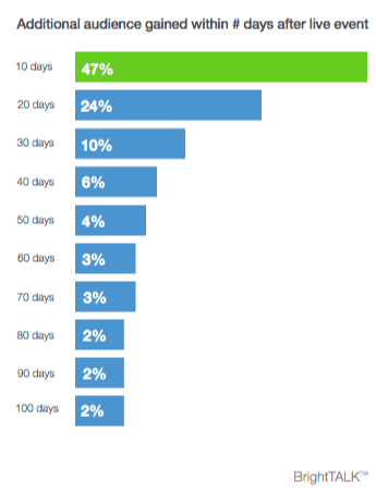 This is in line with what we find where between one quarter and one third attend live. It's slightly lower for us since we have a global audience which means that people in other timezones can't make attendance. We do find with BrightTALK that the automatic reminder emails do encourage viewing of recording such that within a few weeks viewings exceed pre-registrations. The data shows that within a month you get most of the viewings, but it's worth checking back to see who viewed the recording to follow-up on their interest.
