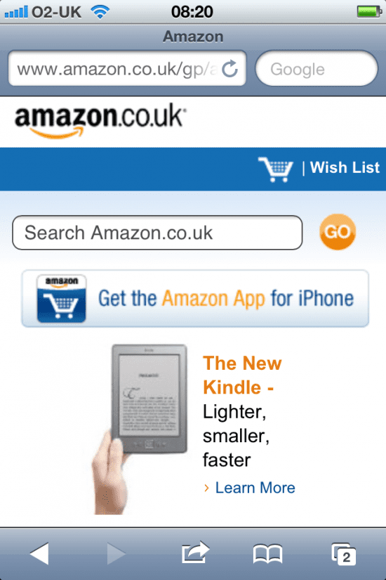 If we take a look at their mobile site, we see Amazon encouraging use of their App together with a relevant Kindle promotion: