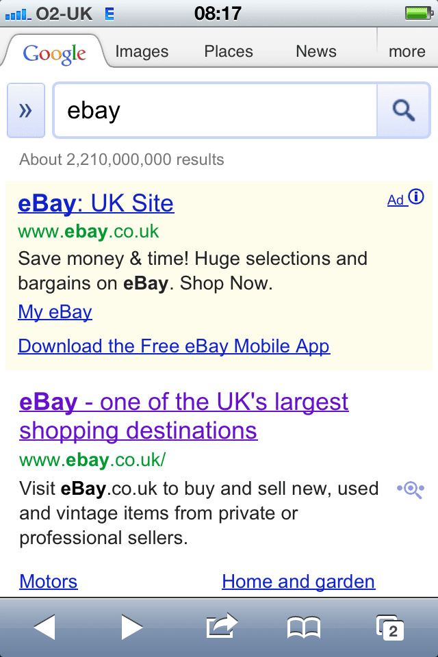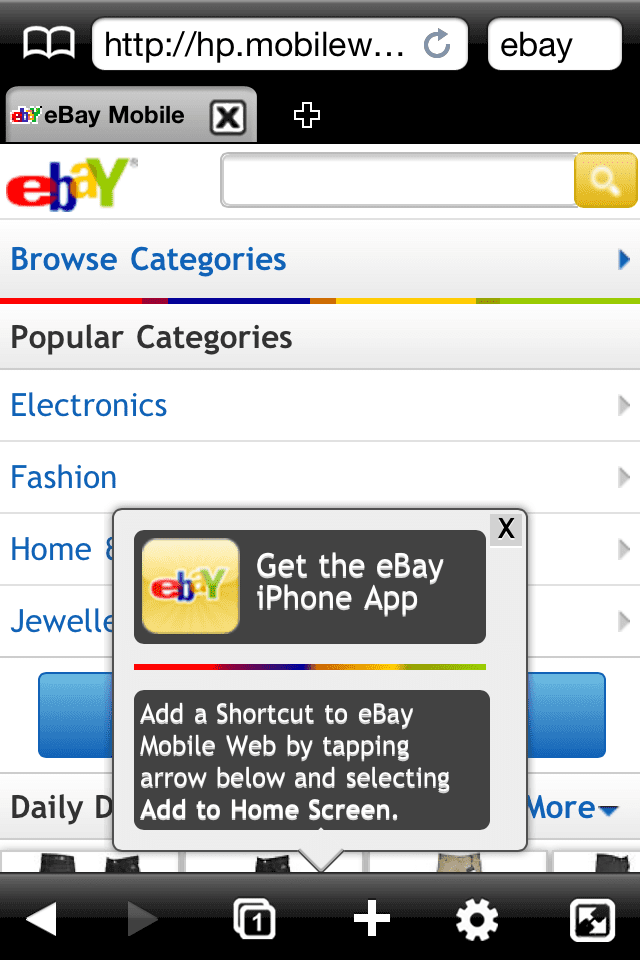 eBay's mobile experience starts with search as it should; their using the platform targeting available within Adwords to feature their mobile site and recommend the app: