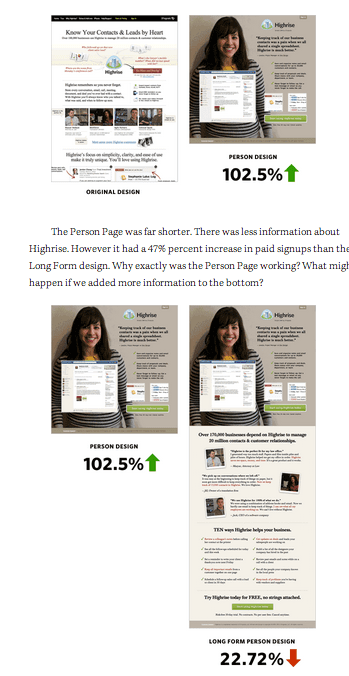 Here's a great example from 37 Signals describing their AB Testing for the Highrise service.