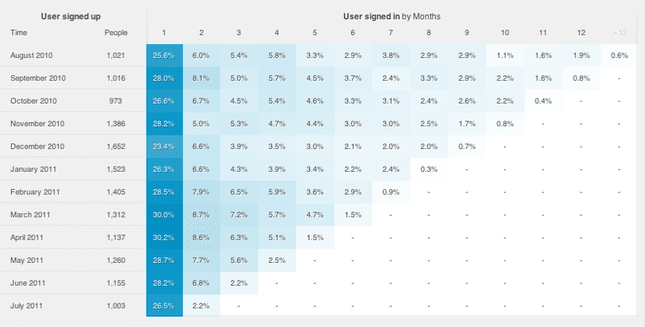 Cohort analysis in the freemium context is the process of understanding groups of customers through the conversion process. Here’s an example from Kissmetrics applied to signed-in users.