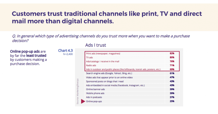 Customers indicated they trusted traditional channels such as TV, print, radio and outdoor ads, over digital channels such as search engines, sponsored blog posts and ads on mobile.
