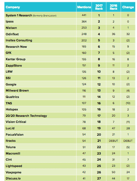 System1, previously known as BrainJuicer has come top or ranked highly for a number of years, their approach to insight is regarded as innovating. They innovate on ad testing and brand tracking.