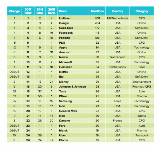 Unilever, Google, Coca-Cola and Facebook are ranked highly as innovative by respondents of the GRIT report.