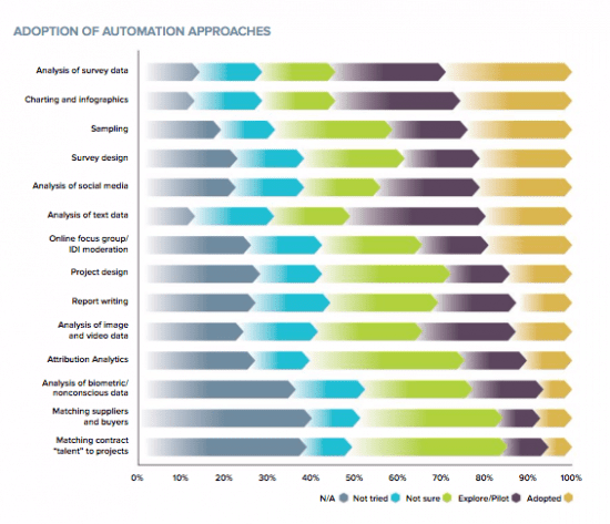 The insight world is focusing on automation. According to the latest GreenBook Research Industry Trends (GRIT) report, there are a number of techniques which researchers are starting to automate, as part of innovating their research. Analysis of test data, project design, matching suppliers and buyers amongst other areas are being automated.