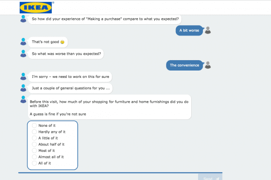 The world of market research and insight has somewhat an obsession with innovation, researchers are always looking for new ways to gain insights, hence big data, online communities, shorter surveys (though I question whether many are actually getting shorter). But in the day to day, researchers tend to stick with the same old quantitative and qualitative methods and IKEA clearly does see the value in the survey, but they (along with their insight agency) conducted a customer satisfaction survey with a twist. They turned the survey into a chatbot.