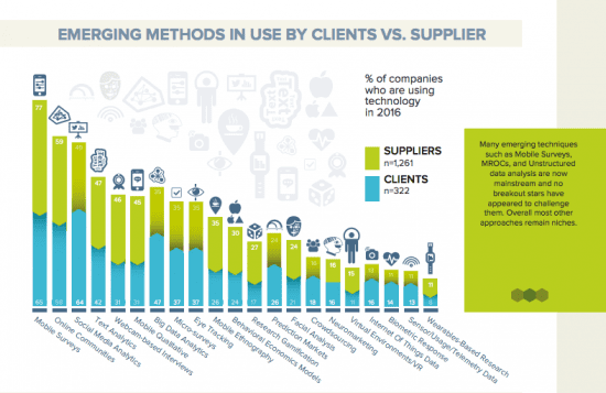 So just how are researchers innovating? According to a previous GRIT report (2016 Q3-4), mobile surveys, online communities and social media analytics are the emerging methods used by both buyers and suppliers. There's been an explosion in the number of research agencies and software as a service (SAAS) companies offering online communities: even panel companies like Toluna have developed an online community offering. Online communities are a little complex to set-up but offer fast turnaround and are cost effective to run, reducing the cost of insight collection compared to "traditional methods".
