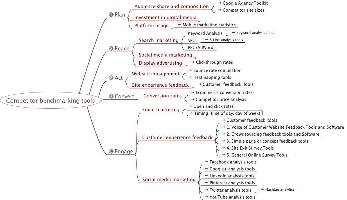 The mind map diagram below shows how I see the many different types of benchmarking activities that can be helpful for informing your marketing strategy, plus where they sit within our RACE Framework.