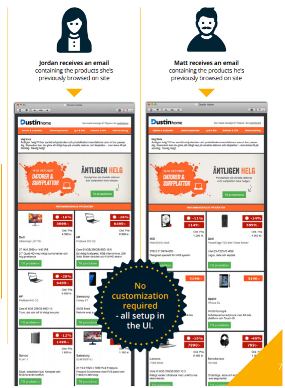 Dustin, a re-seller of IT products and services in the Nordics, automate email content to show each individual recipient highly personalized products, specific to their individual browse behaviour. With Content Automation it is no longer necessary for Dustin to insert products manually, segment or split send categories for different target groups, for example B2B and B2C groups. From one email, B2B customers will receive the exact products they have browsed with the B2B price, B2C customers will receive the exact products they have browsed with B2C pricing, all from one send. This has significantly reduced email build and creation time and has enabled Dustin to send email that is truly personalised at a 1-2-1 individual recipient level.
