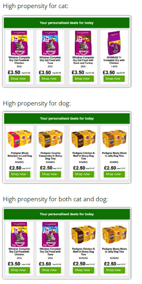 Another example we can all relate to comes from supermarket Asda. Instead of 4 generic product offers, customers with a propensity to purchase from a category are automatically shown products from that category that are: