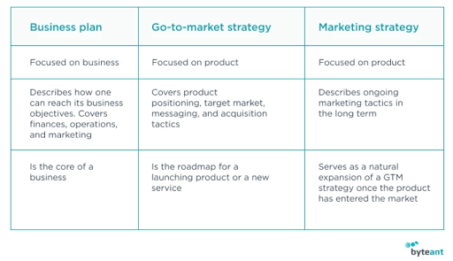 The software development company ByteAnt provides a neat summary of the differences between different types of marketing plans and how a go-to-market fits alongside each:
