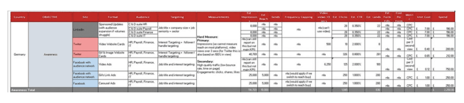 This plan is where you can zoom in on all the specific elements we saw in the high-level plan above. It’s common practice to look at each channel in precise detail (separate plans for paid, owned, earned media etc.) so that those running the go-to-market campaign have a clear view of exactly how each element will be executed. This is important so that media and creative can be signed off and bought.