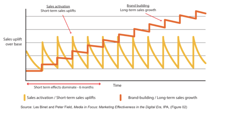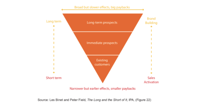 A long-term brand building focus can generate bigger paybacks on the long term, while short term sales activation, for example engaging existing customers has narrower but earlier effects.