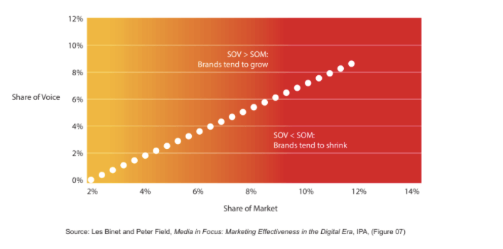 Historically, share of voice has driven share of market. If share of voice is greater than share of market the brand tends to grow, whereas is their share of voice is less than share of market the brand tends to shrink.