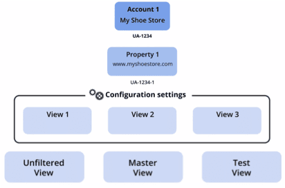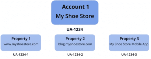 Based on my experience teaching analytics, in a room of 20 people, 1-2% have got their set up in order. Starting with their property and views, you have Accounts this is a logical way that your Google Analytics account is structured. A Property is used to independently collect data; you can have more than one, depending on your online needs. The example below from Google shows a property for the website www.myshoestore.com, a second for the blog as it is on a different url blog.myshoestore.com and a third for their mobile app. If you just have one website, you will only need the one property.