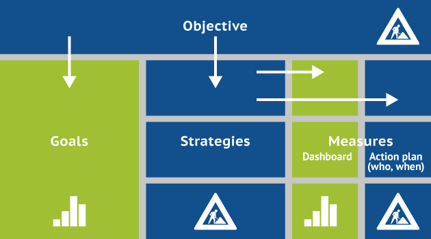 OGSM stands for objective, goals, strategies and measures. It's a way of defining what you want to achieve, and how you will get there. The model divides your aims into broad objectives, fixed and measurable goals, strategies to guide your actions, and measures to give you a direct way of monitoring your progress. Here is how the parts of the OGSM model link together.