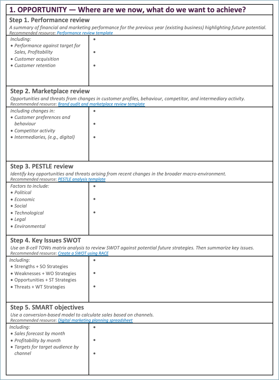 - Opportunity: Situation review including marketplace analysis (customers, competitors and channel partners), performance analysis and SMART Objective setting based on forecasting (spreadsheet tools available in our templates)