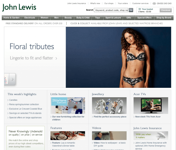 I like the way John Lewis also show their multichannel 'click and collect' offer. They also have a panel on the lower left of the home page which summarises their offer.