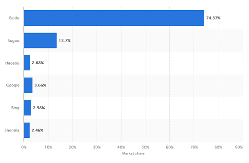 Baidu search has the highest market share across both desktop and mobile users. According to Statista, Baidu boasts 74% of the Chinese search market, with Sogou coming in second place with almost 14%.