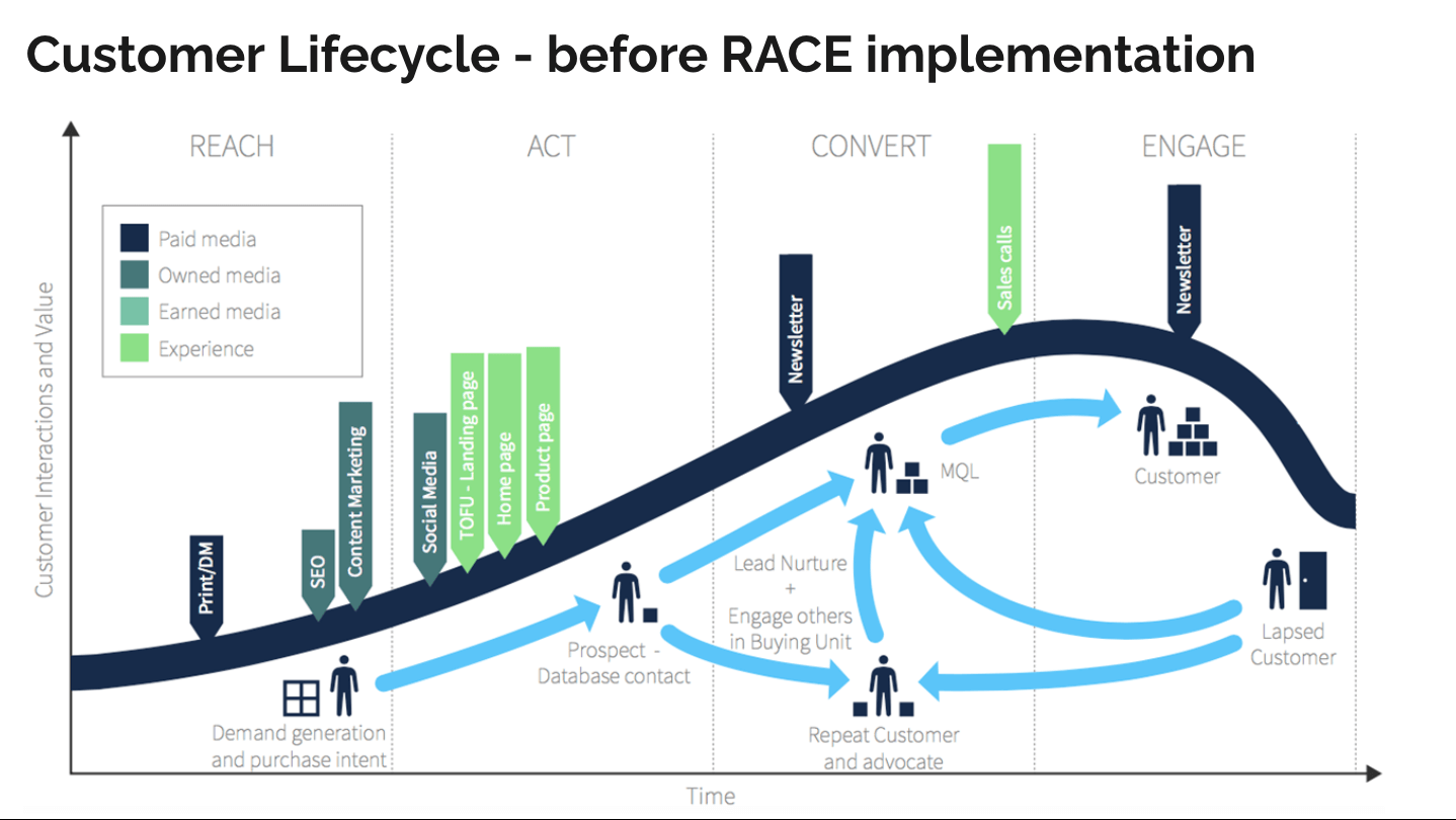 You can see an example of a full RACE customer lifecycle below. Of course, we're not suggesting that you jump straight from example one to example two. However, by using this template, you can review the gaps you may have in your marketing activity and plug the gaps.