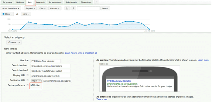 On the ads tab in the Adwords interface if you click on '+ New ad' then select 'text ad' you will see that there is a small tick box for the device preference. This allows you to write ads focused for the user based on their context being on a mobile device.