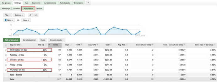 Bid adjustments can go both ways, so in this example Monday has the best cost per conversion so we have increased our bids by 20%. On Wednesday and Thursday performance tends to be worse so we have reduced bids by 20%.