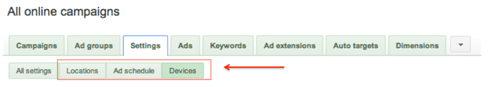 Under enhanced campaigns you can bid separately based on locations, ad schedule and device. In the screenshot below you can see the 3 tabs in the campaign settings for each of these preferences.