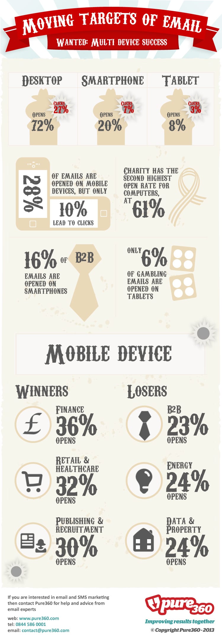 Some new research by Pure360 Missing a moving target: Mobile device opens and click through rates summarised in this infographic reviews the impact across different sectors.