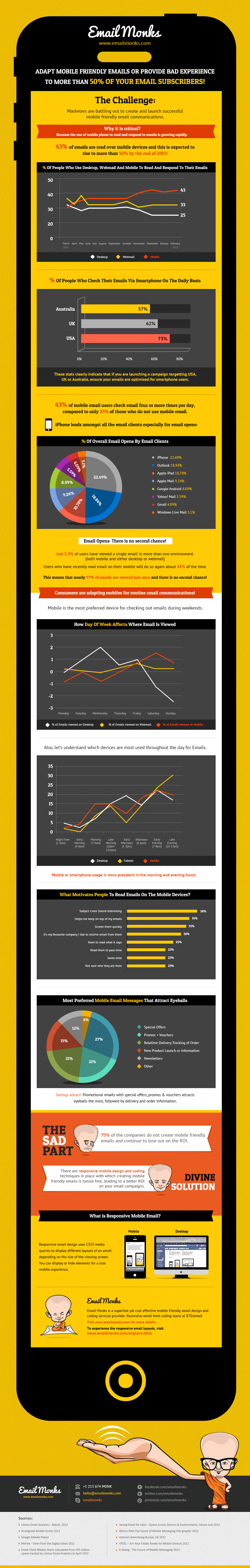Email Monks infographic on Mobile Friendly Emails will walk you through the importance of adapting responsive mobile email design techniques in 2013.