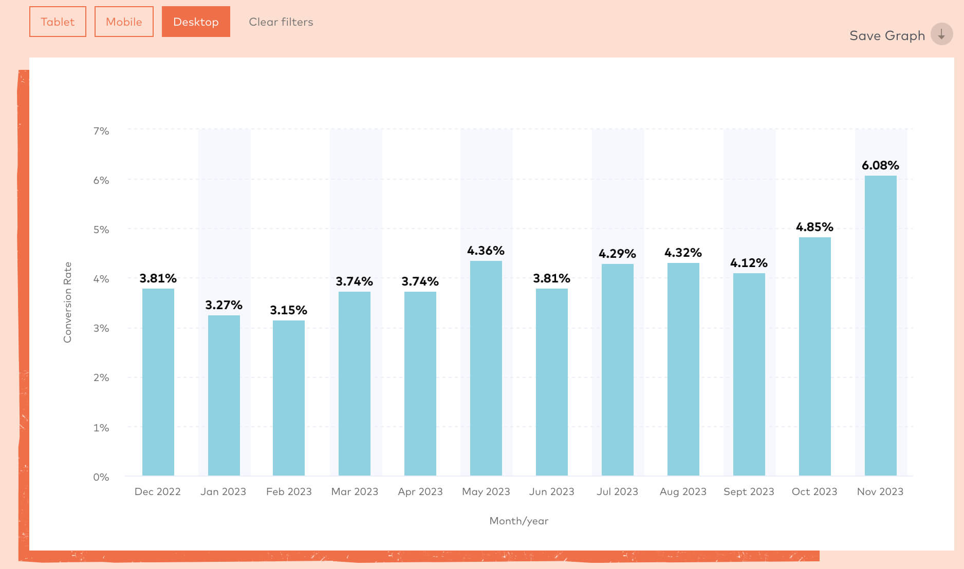 Smartphone conversion rates for retail average around 3%, but conversion is higher during seasonal sales in November and December. Desktop conversion rates tend to be higher since this is a preferred method of checking out for the multichannel majority who have a choice between mobile and desktop.