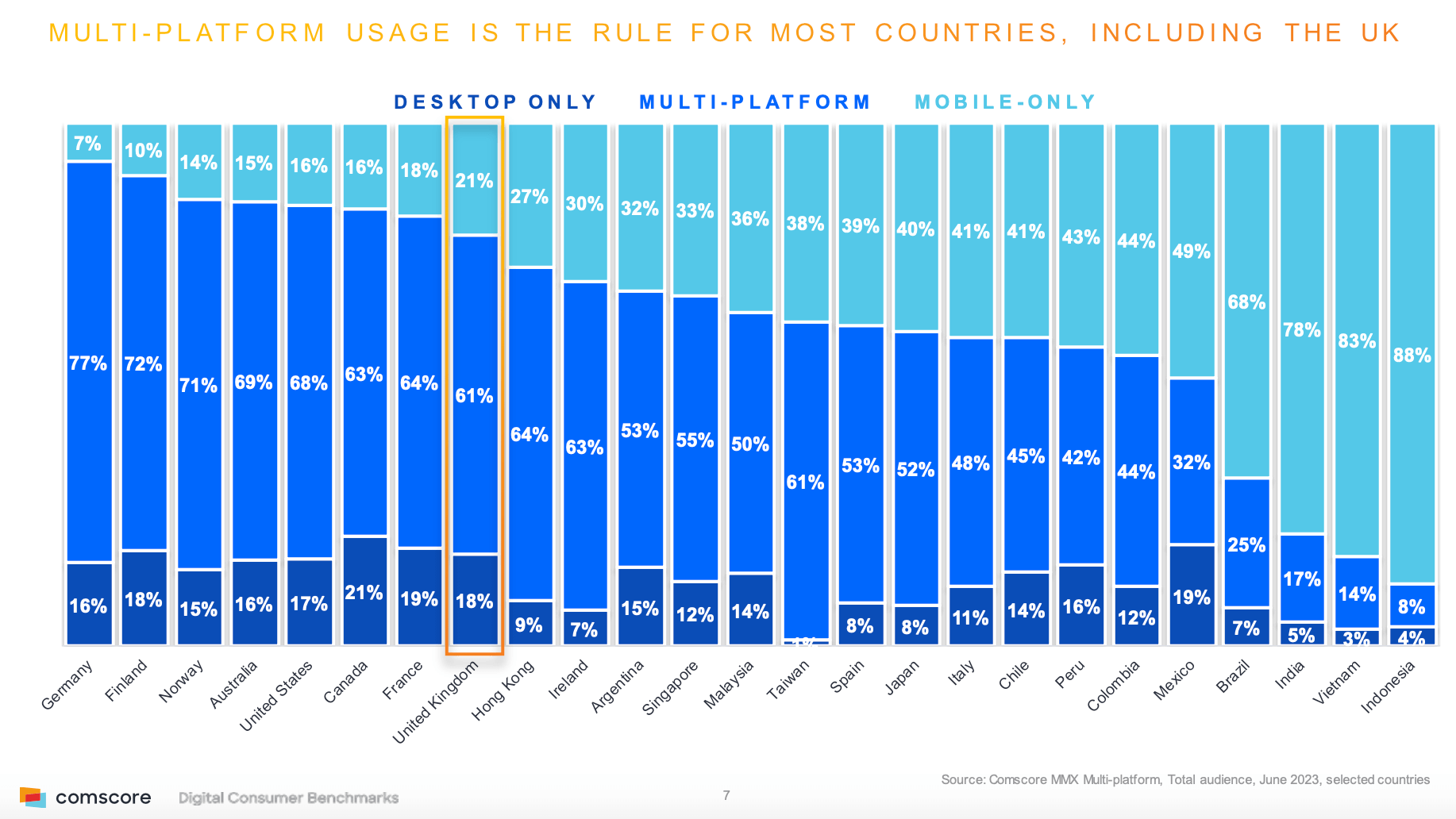 With the wide adoption of 'Mobile first design', it's important to remember that in developed countries, much device usage is multiplatform i.e. consumers will use both smartphone and desktop. This Comscore panel data added in the 2024 update to this post shows how the multiplatform form the majority in many countries.