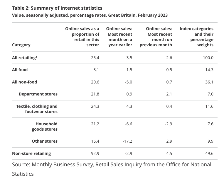 On the other hand, department stores made up only 7% of sales. And while textile , clothing and footwear categories saw YOY growth of 4%, household goods were down 7% in Feb 2023.