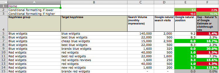 - A master worksheet enabling you to compare the actual number of visits to your site for your various target keywords against the total number of searches (impressions) measured as an exact match. Conditional formatting enables you to quickly review where there is an opportunity to improve position or clickthrough rate (share of search).