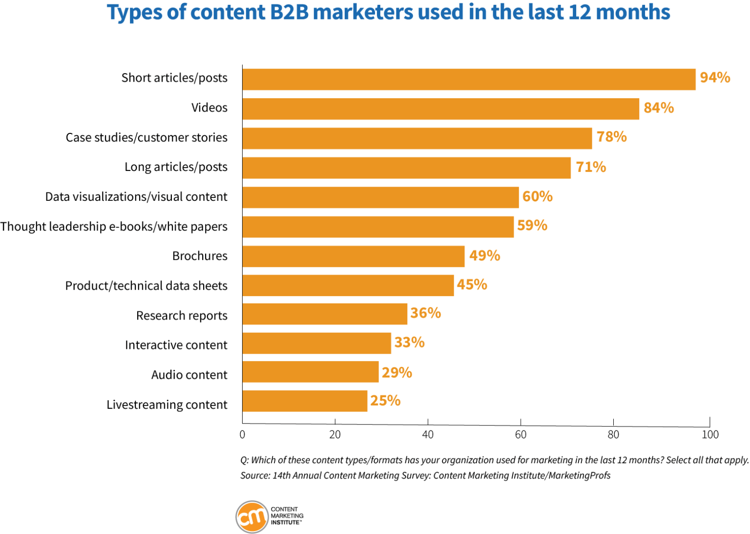 From a practical point-of-view, what types of content marketing are proving popular? The CMI research is useful for benchmarking. TBH, this leaderboard looks similar to what it would have 10 years ago, but Video content is significantly higher than in previous years, it has been gradually growing.