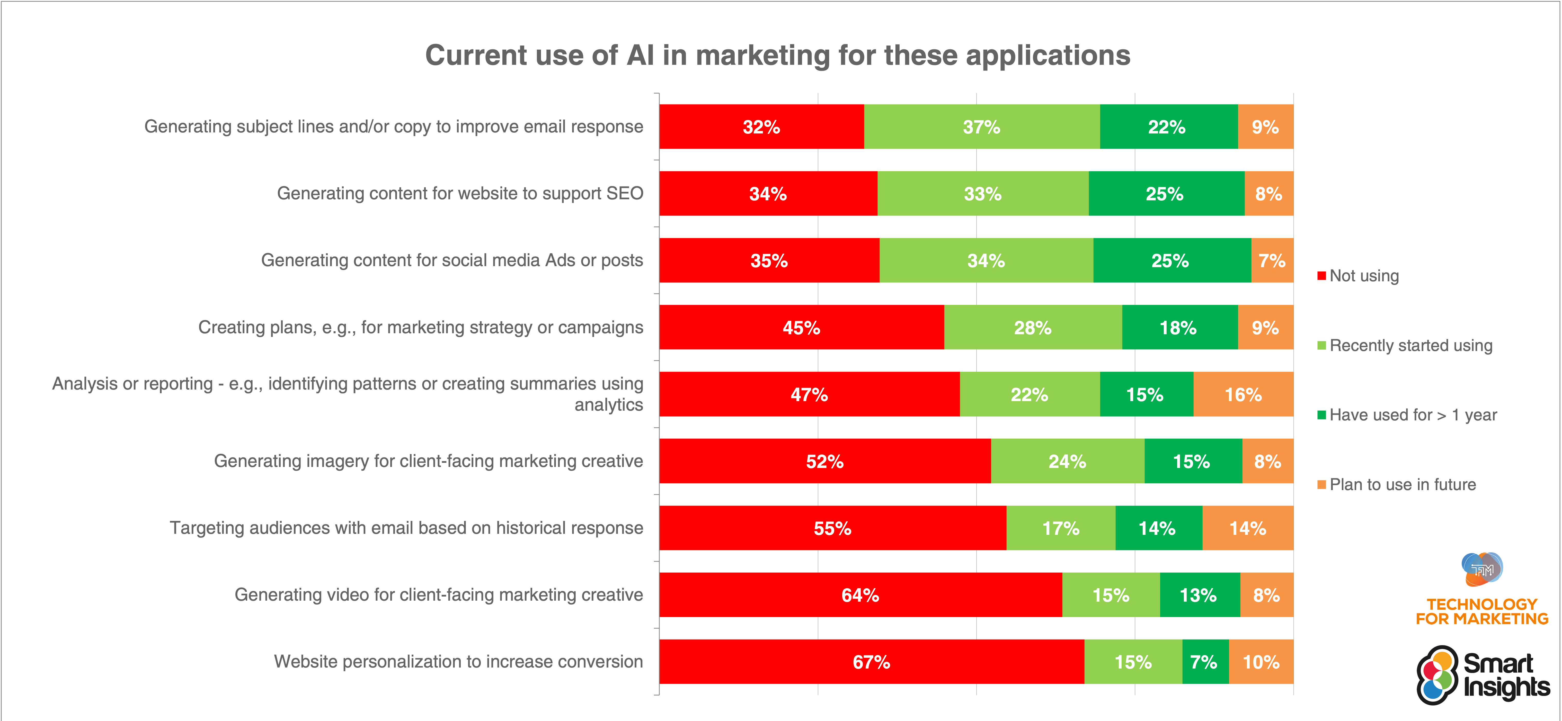 The most common applications of AI were, nevertheless, using it to support copywriting for email marketing, organic search and social media. Over one half of respondents were using it for these purposes.