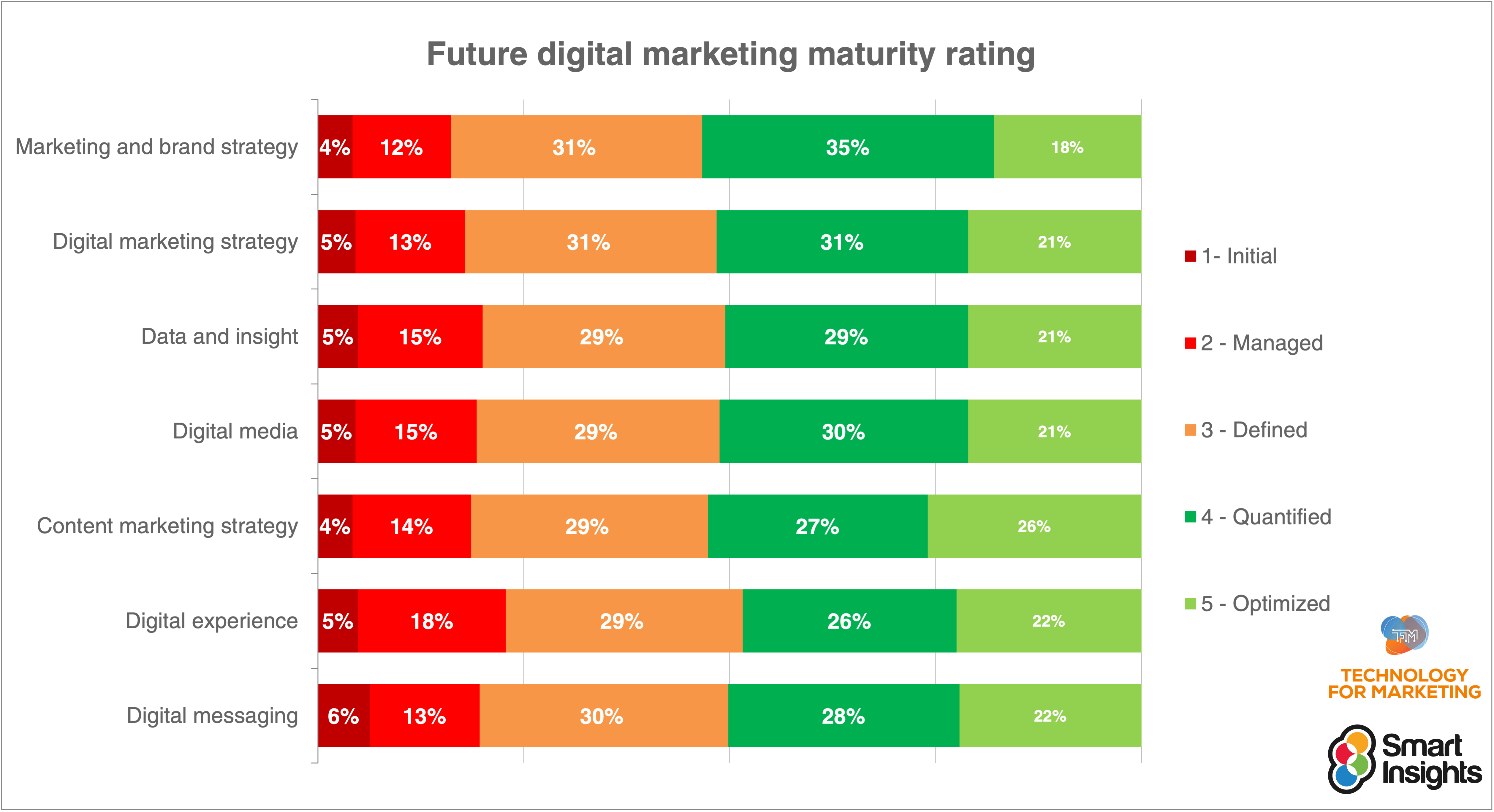The previous chart is a symptom of a bigger malaise, which is a surprising lack of digital marketing maturity in many businesses. All this activity and investment is aimed at improving digital marketing capabilities, so in the research we asked where people were now with using digital marketing and where they would be in the future.