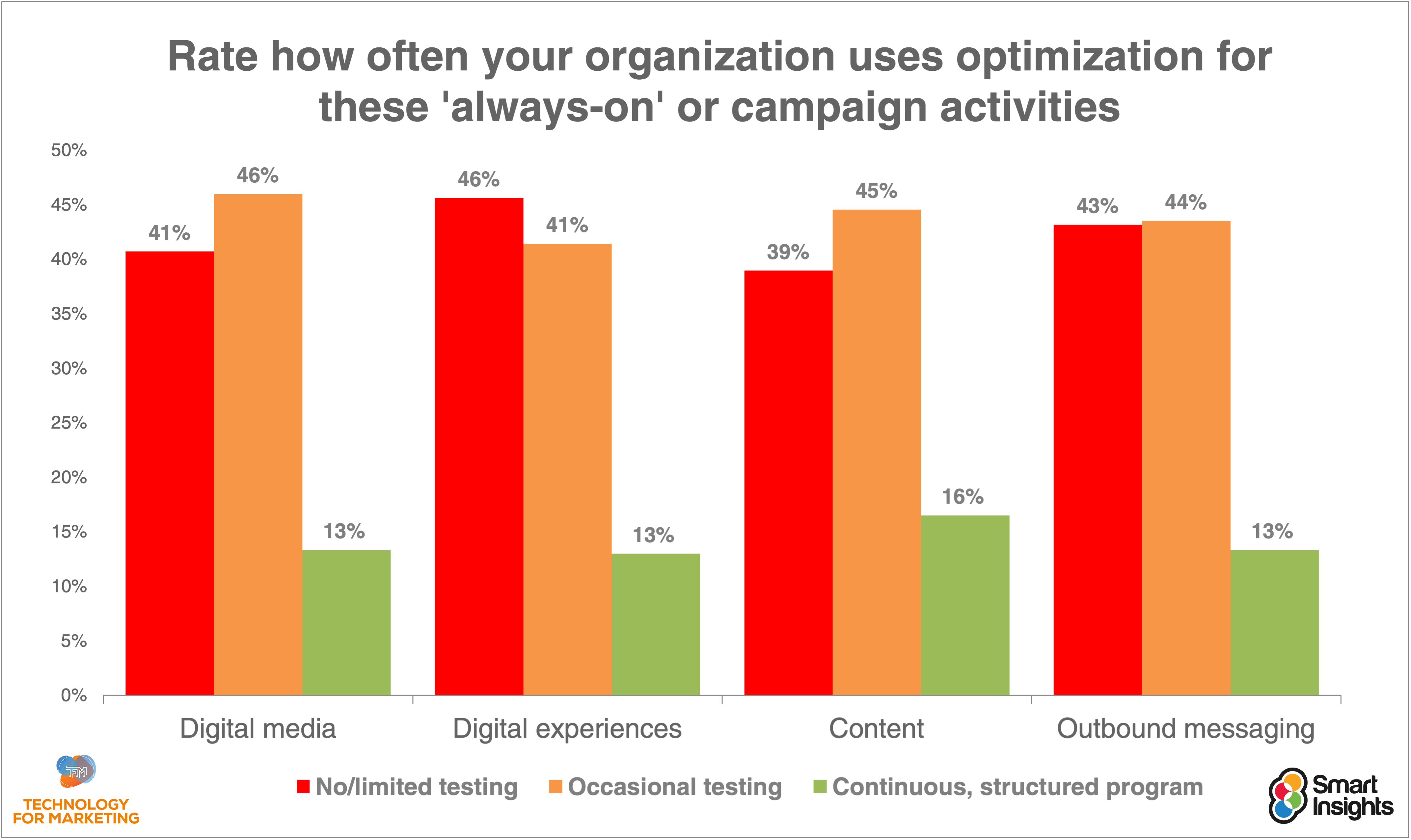 The standout finding from this chart is that a continuous, structured programme of testing is relatively uncommon, despite the often-touted benefits of digital media being ‘the most measurable’. Kudos to the fewer than 20% of companies that already have a continuous programme in place, and to those that at least test occasionally (around half of businesses)!