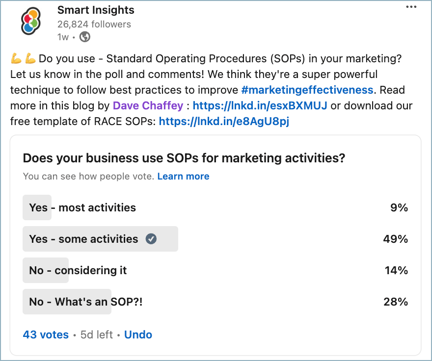 We didn't ask about SOPs in the main survey, but our LinkedIn poll suggests many are using them, but equally many aren't. I found out about them several years ago where they were being used in the United States applied to E-commerce. This is a great fit since there are many repeatable processes in an online retail store. I think they are less well known in the UK and Europe, but interest is increasing based on the popularity of the post below I wrote about them.