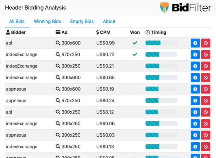 To understand how this works, Header bidding Chrome extensions like BidFilter can show bidding times and bids for a publishers website: