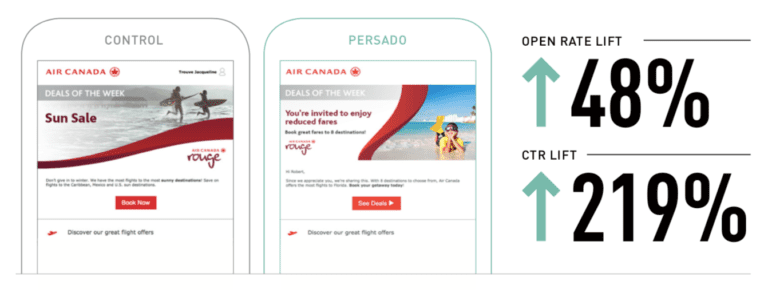 For example, using Persado Natural Language Generation to run an experiment, Air Canada sparked a higher response using Anxiety language getting a 3% engagement lift, compared to a 5% drop using Exclusivity language, and a 3% drop using Safety language.