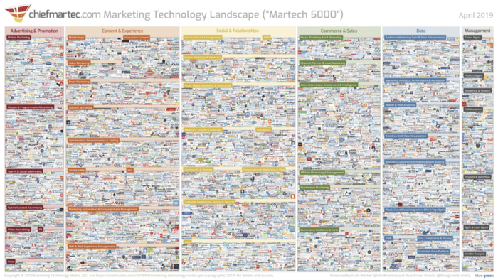 The latest 2019 Martech supergraphic from Scott Brinker, a specialist who hosts Martech conferences and has advised on technology for HubSpot, has created this somewhat scary map of all the potential categories and services that companies can use.