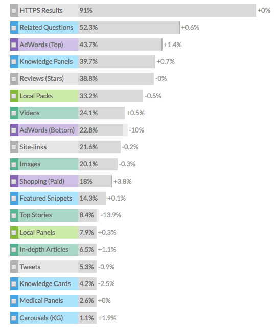 This shows the importance of the features integrated into the organic SERPS of which related questions are currently at an all-time high with images and featured snippets remaining important. The prominence of these features shows the importance of understanding and answering the questions your audience ask as a more conversational search develops via smartphone and voice-activated smart speakers. The chart also shows the near complete switchover to secure https amongst leading sites the Mozcast monitors in its review of SERPS for 10,000 commonly used keywords.