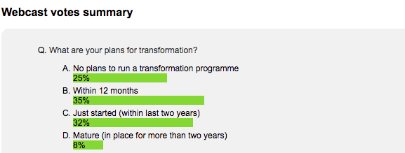 A key trend in overall digital strategy development is the ongoing popularity of digital transformation programmes. A recent poll on a members' webinar in digital transformation showed that a third of businesses are planning transformation within the next 12 months with a quarter already having embarked on them. This is similar to what we’ve seen in our more general surveys.