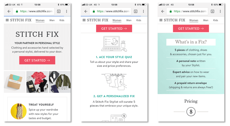 The first step in this process happens as soon as the customer creates their Stitch Fix account. Customers who set up an account, either through their email or by connecting to Facebook, are led through an extensive questionnaire called the Style Quiz which is an example of a conversational UI.