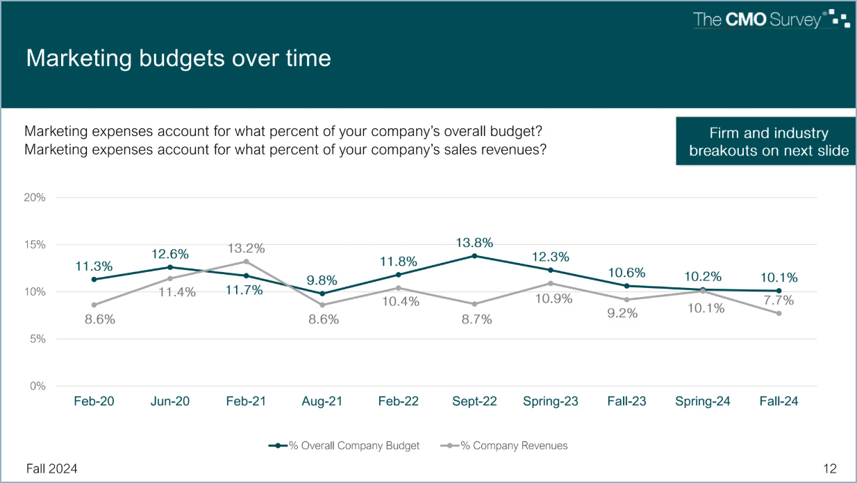 Did you know, as of Fall 2024, marketing accounts for 10.1% of overall company budgets, and around 7.7% of company revenues? This according to the latest CMO Marketing Budget survey which has a sample of c2200 marketing leaders at US companies of all sizes.