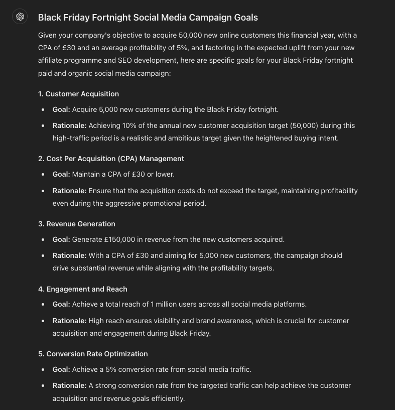 Already, we are starting to consider different ways of approaching the end goal by setting specific campaign targets. With more iteration and a final human edit, I could envisage these goals being fit for your next campaign faster than starting from scratch.
